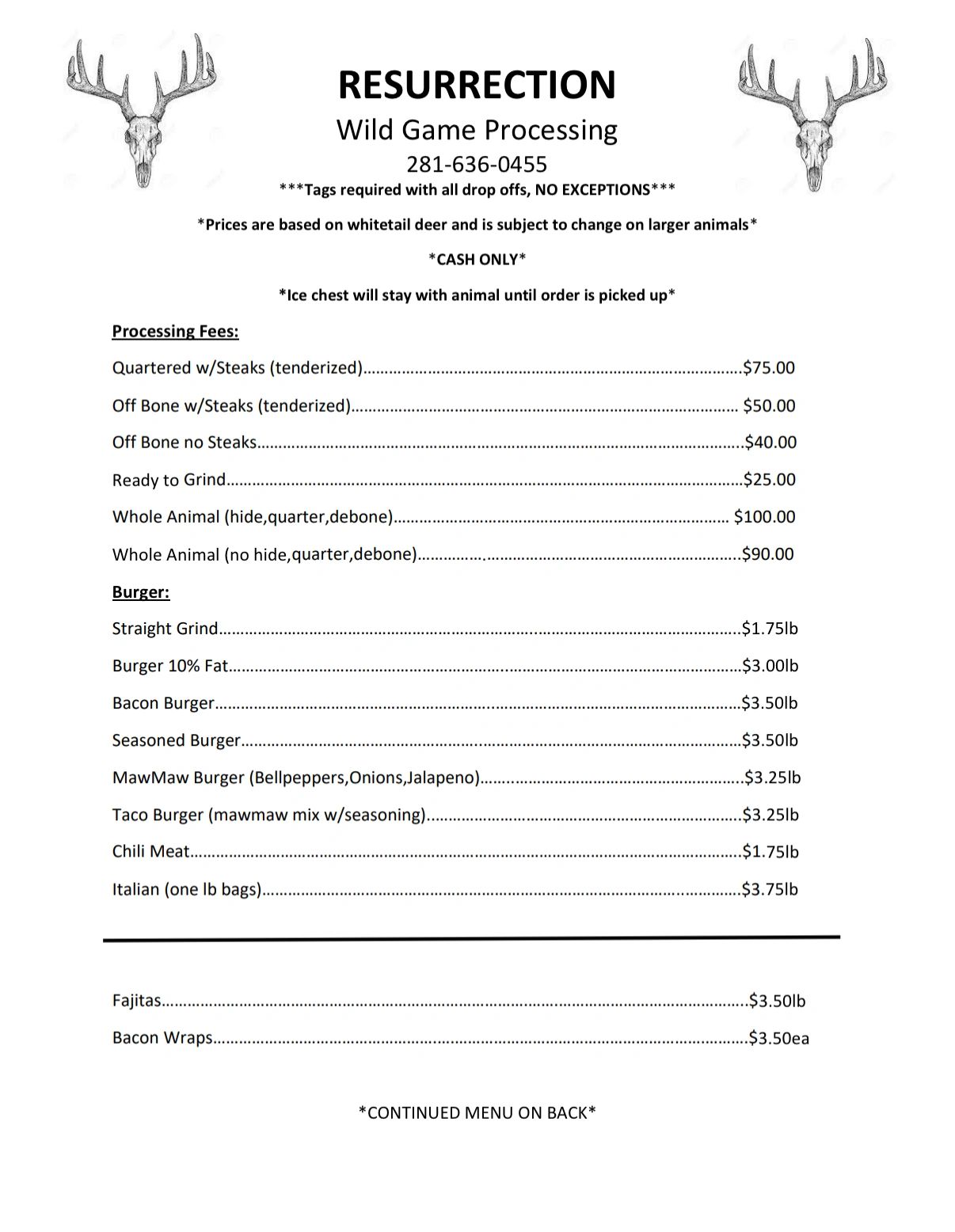 We try to get your meat back to you within 1 week, and your skull back in about a month. Some weeks are busier and may require a little patience as we all have full time jobs and do this during the season as it is a passion of ours, and something we love to do for you.